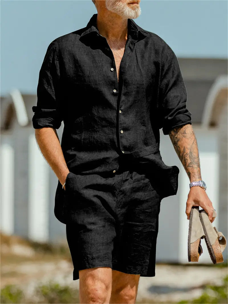 Pring Summer Green Casual Long Sleeved Shirt And Shorts Set