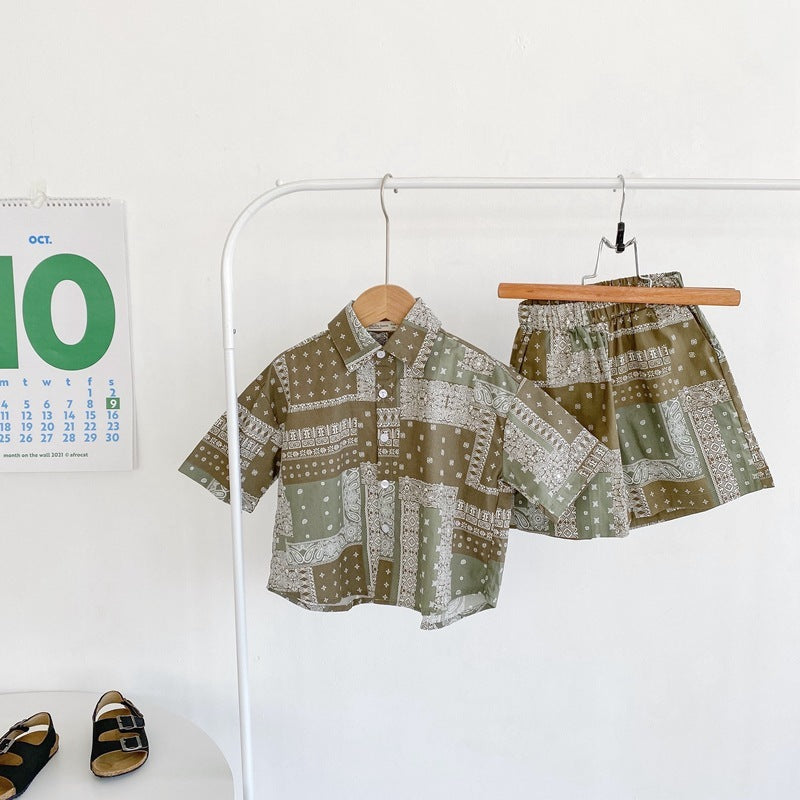 Retro Cotton Cashew Flower Shirt Two Piece Regular Kids Set is a charming, breathable summer outfit for kids. Made from soft cotton, this all-match two-piece set features a playful cashew flower print on a short-sleeve shirt paired with matching shorts, designed to keep little ones comfortable on warm days.