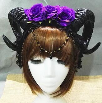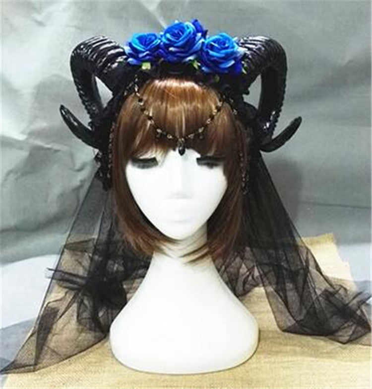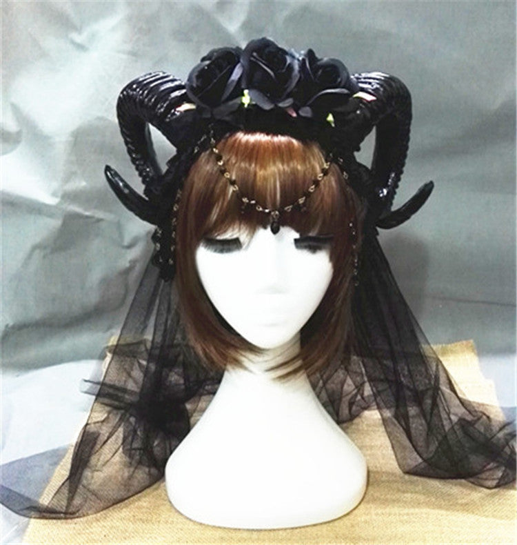 Three Roses Headband Halloween Vampire Demonsheep Horn Veil Hair Accessories