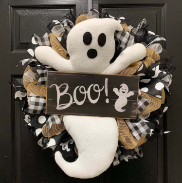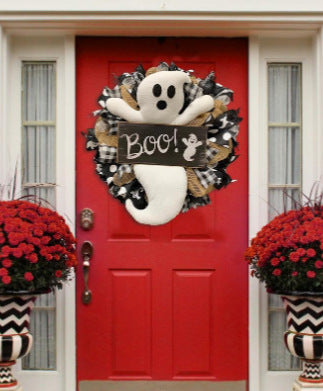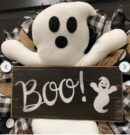 This adorable farmhouse ghost Wreath was created using natural jute and black and white mesh. Decorated with 4 different ribbons, plush ghost, and B o o sign.