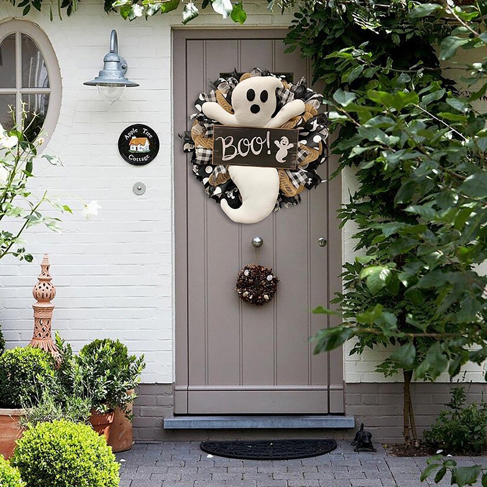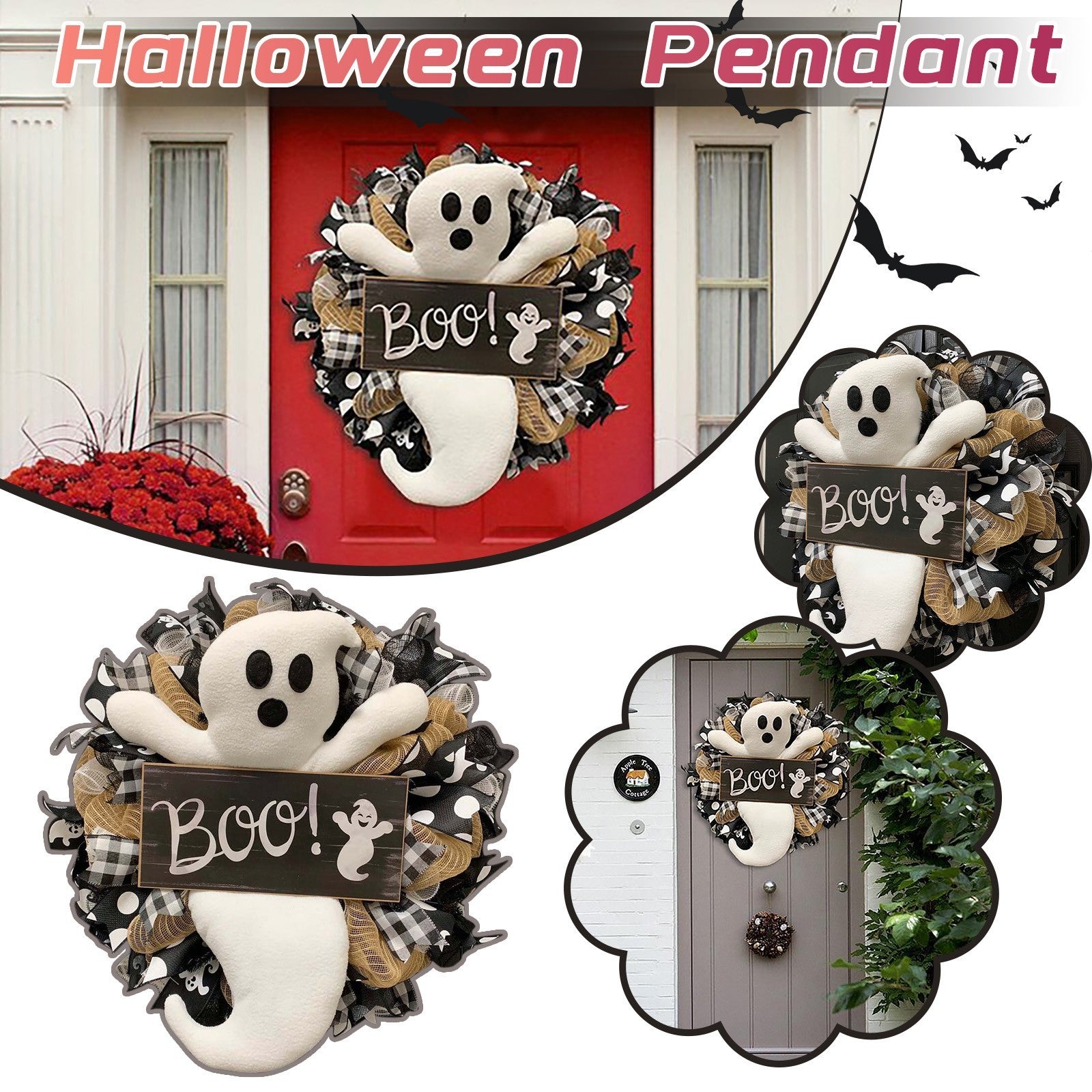 Halloween Wreath BOO Farmhouse-Ghost Wreath Outdoor Front Door Indoor Wall Decor Honeycomb Ghost Smiley Balloon For Halloween