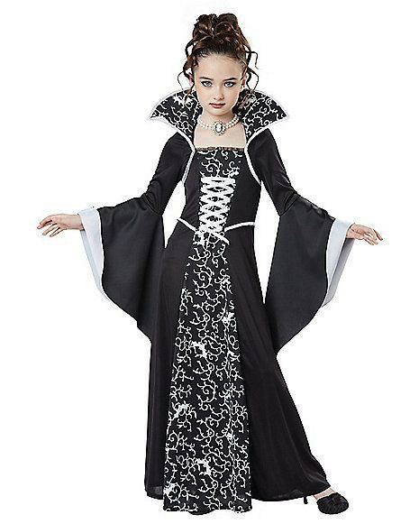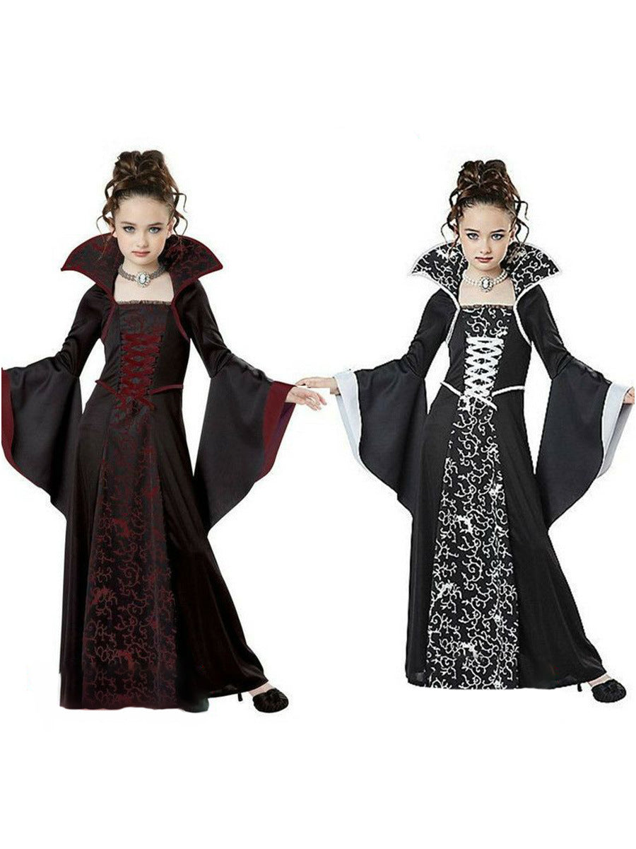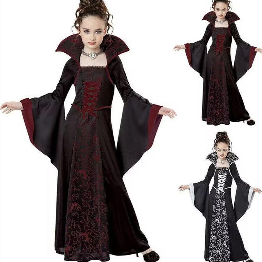 Children's Halloween Costume Witch Retro Lace Up Stand-up Collar Flared Sleeves Printed Maxi Dress