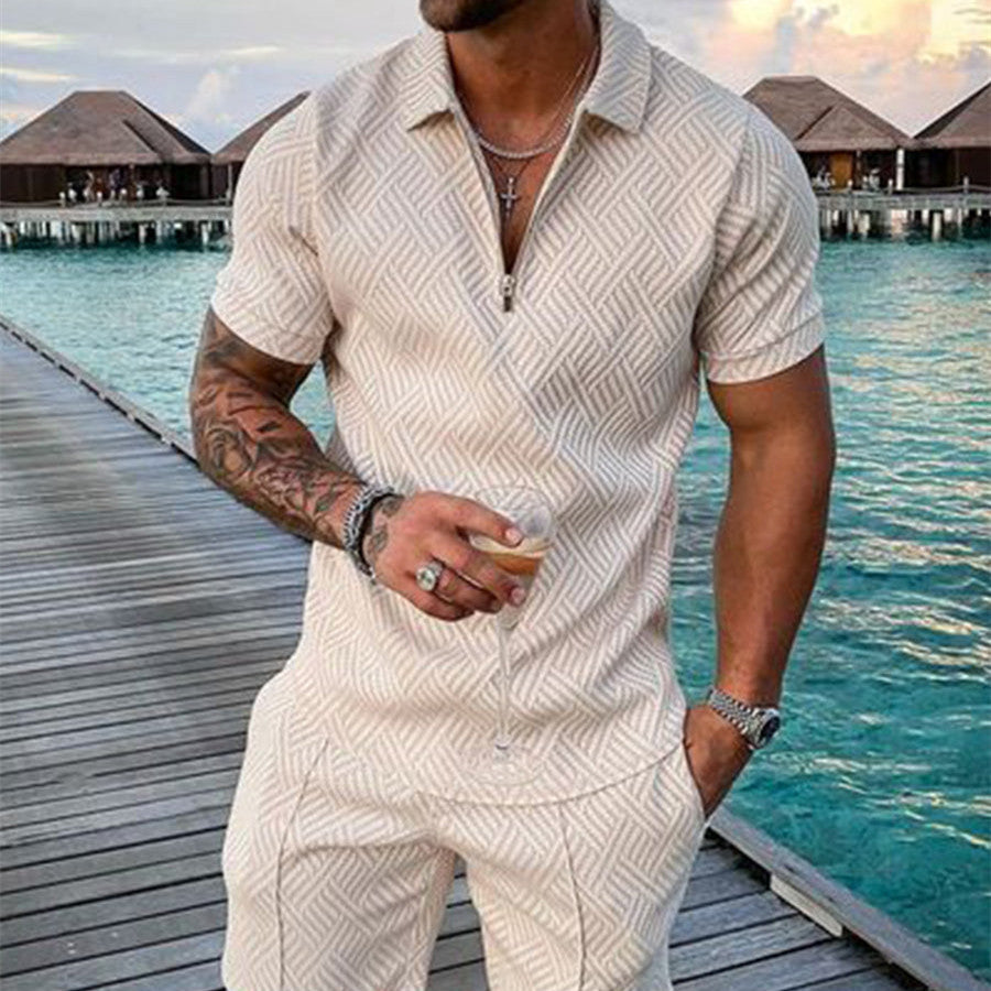 Men's Summer Fashion 3D Printed Short Sleeve Geometric Zip Lapel Shirt Set