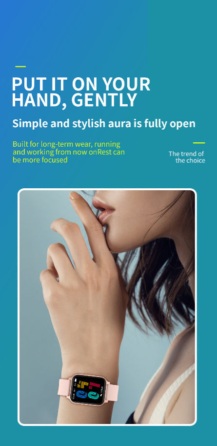 Functions: Waterproof, step counting, heart rate monitoring, blood pressure measurement, body temperature measurement, Bluetooth call, smart reminder, remote control selfie, sleep monitoring, blood oxygen detection