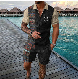Men's Summer Fashion 3D Printed Short Sleeve Geometric Zip Lapel Shirt Set