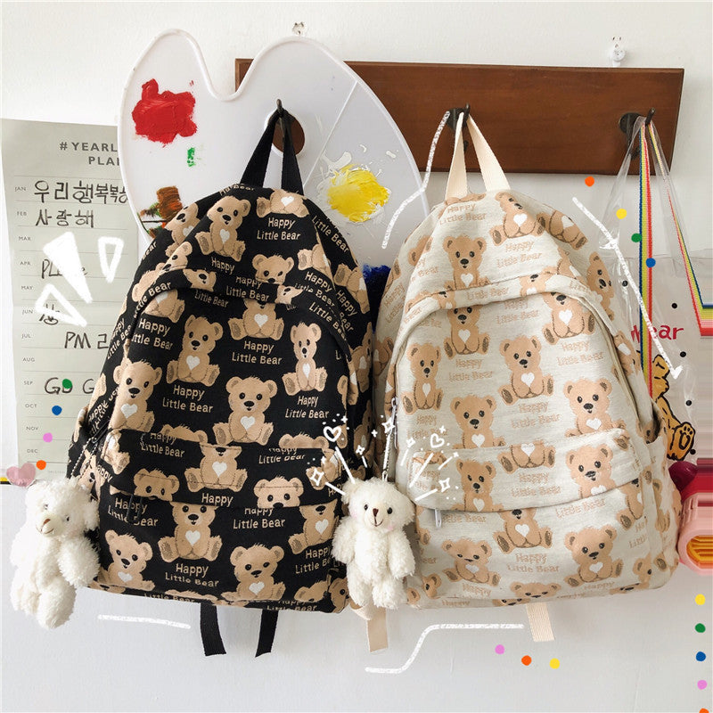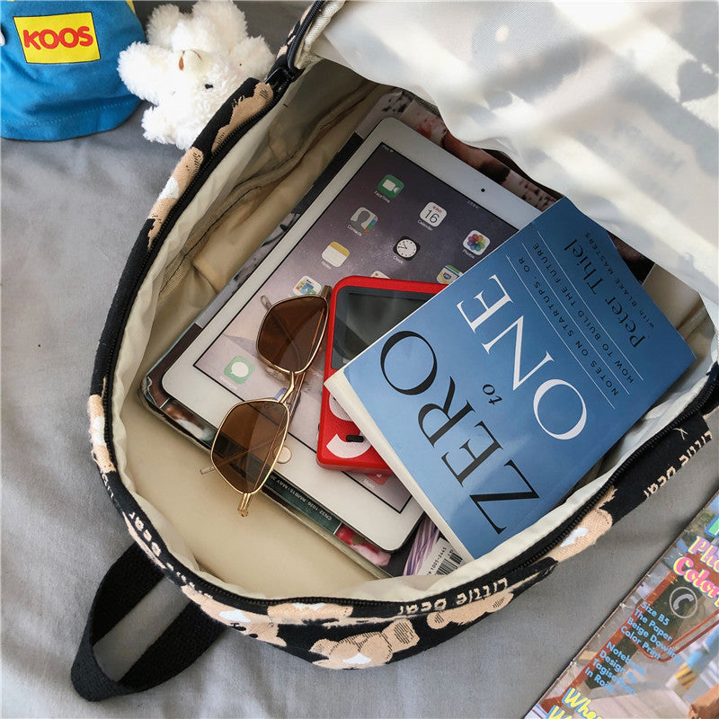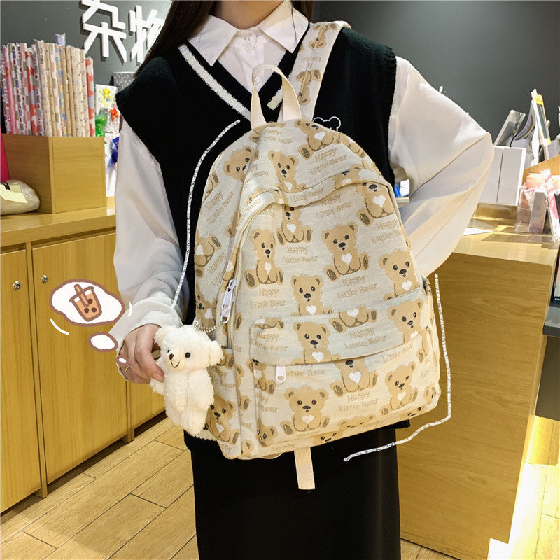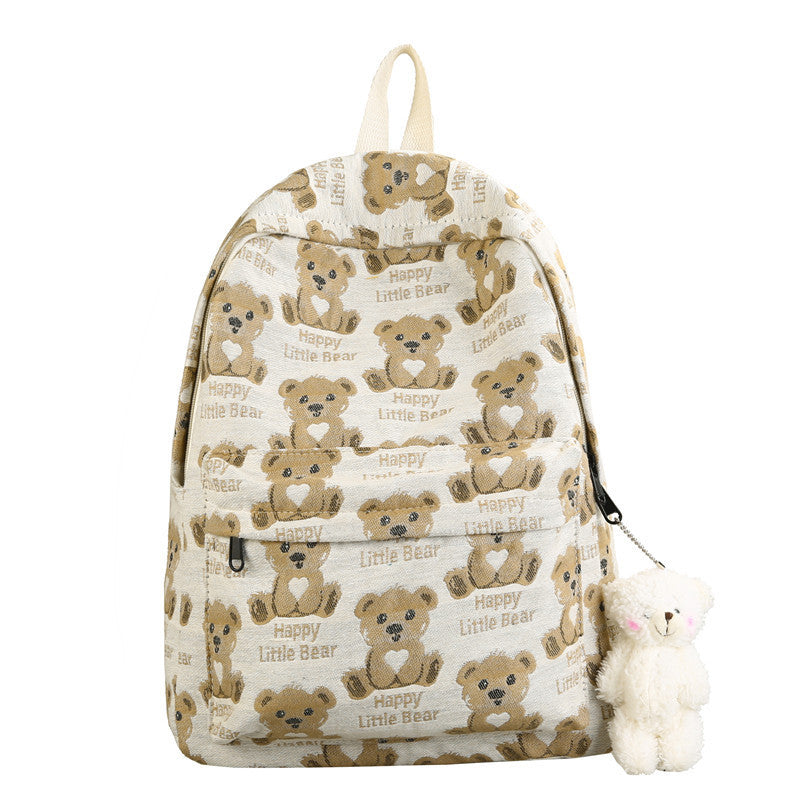 Women's Cotton Bear Pattern Backpack Cute School Bag blends a playful bear pattern with breathable cotton for comfortable daily use at school or on the go.