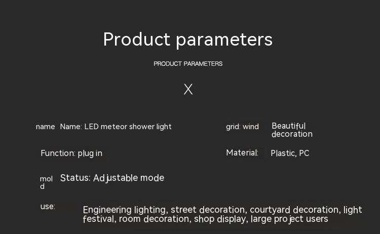 Power supply: European standard round plug 50cm patch meteor shower 8 pieces suit, American Standard flat plug 50cm patch meteor shower 8 pieces suit, European standard round plug 30cm patch meteor shower 8 pieces suit, american Standard flat plug 30cm patch meteor shower 8 pieces suit, European standard round plug 80cm patch meteor shower 8 pieces suit, American Standard flat plug 80cm patch meteor shower 8 pieces suit, digital meteor shower 50cm highlight
