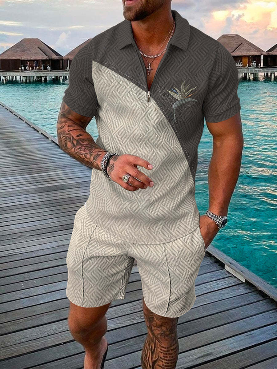 Men's Summer Fashion 3D Printed Short Sleeve Geometric Zip Lapel Shirt Set