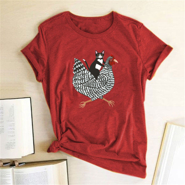 Cat Riding Chicken 3D Print Short Sleeve Funny Womens T Shirt Summer New Products Casual O Neck Wild Street Hipster Loose Ladies