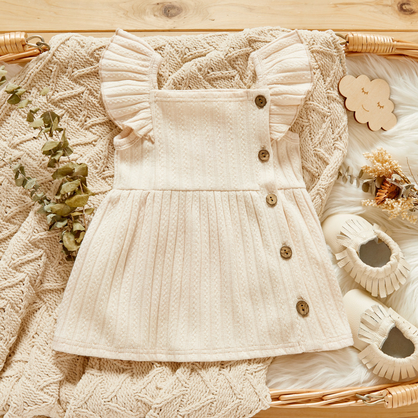 Pattern options include plaid, solid color, and cartoon prints in soft colors like pink, khaki, and beige. Designed for infants and toddlers, it suits heights from 0-3M up to 12-18M and pairs beautifully with lightweight tops for sunny days.