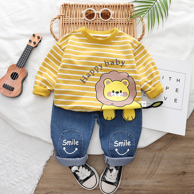 Boys Cotton Two Piece Spring Autumn Long Sleeve Outfit offers everyday comfort and playful style for boys. This two-piece set features a soft cotton pullover top and matching trousers with a charming cartoon pattern, making it a versatile choice for school days, weekend outings, and cozy evenings at home.